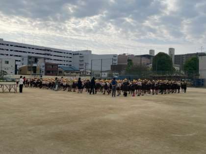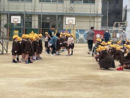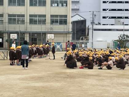 1年生を拍手で迎えた後、6年生代表児童からお祝い(歓迎)の言葉、2年生より朝顔の種のプレゼントがありました。