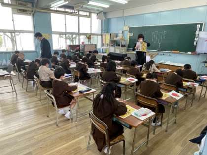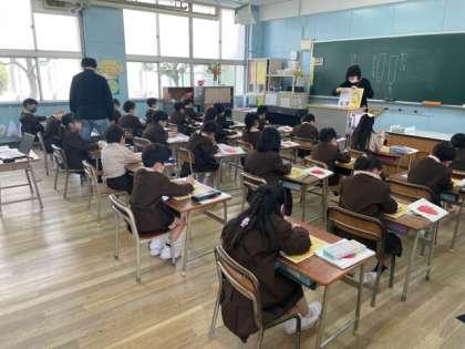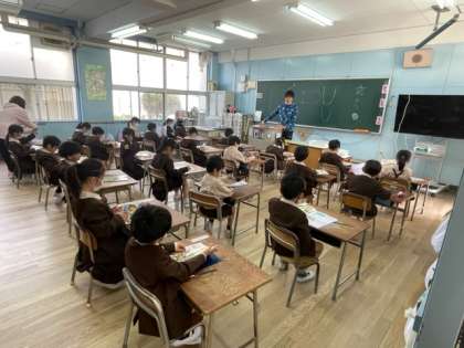 1年生の教室では、ひらがなの「つ」を学習していました。正しい形を覚えるだけでなく、書く時の姿勢や鉛筆の持ち方などこれからの基礎となることも学んでいました。何事も基本が大切です。皆さん集中して頑張っていました。