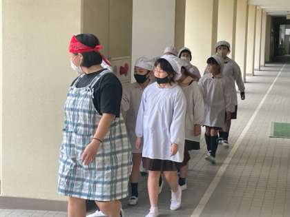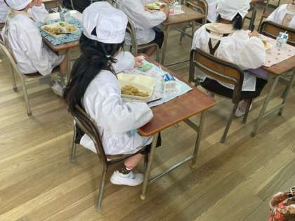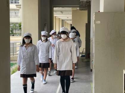 きっちり整列して給食をとりに行きます。1年生の皆さんは、もう給食に慣れたかな。いっぱい食べて大きく成長してください。