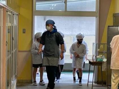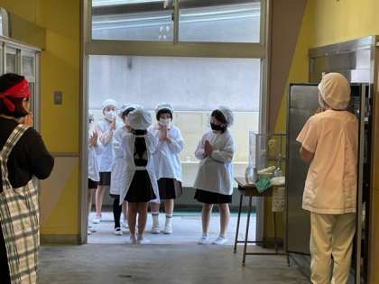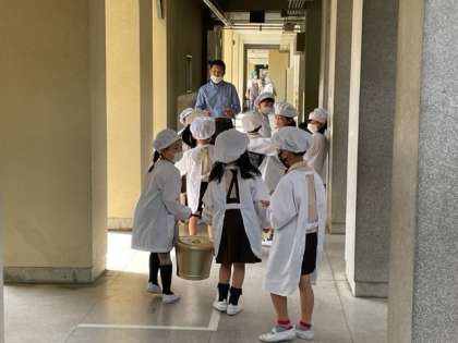 上の写真では、向かって右側が大、小おかずや味噌汁を置いているところになります。左側がごはんを置いているところです。牛乳は、別の部屋になります。それでは、いただきます。