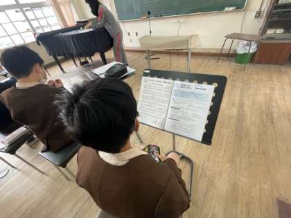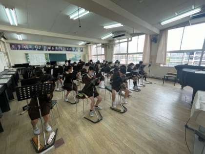 音楽室でリコーダーの練習をしていました。フラットやナチュラルの記号に注意しながら演奏するように指示されていました。