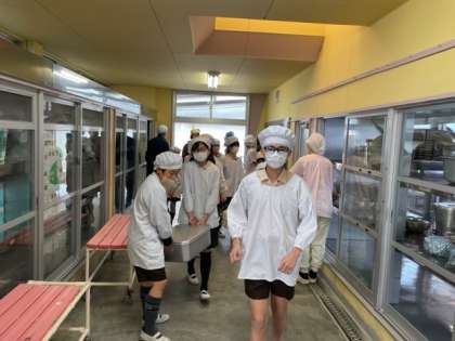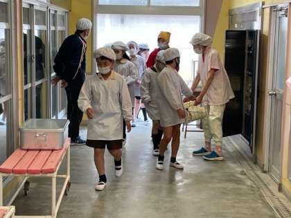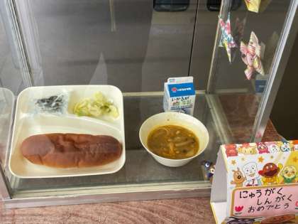 カレースープスパゲッティ、キャベツのピクルス、ミニフィッシュ、黒糖パン、牛乳 です。