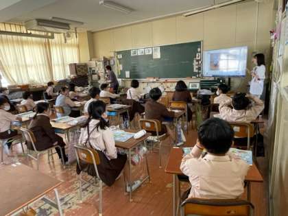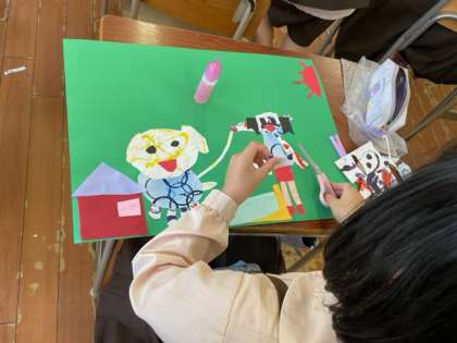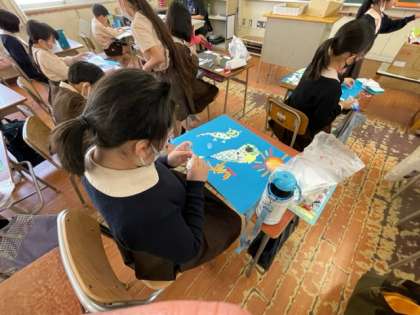 1組が英語、2組が図画工作をしていました。図画工作は、切り絵です。