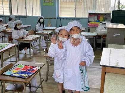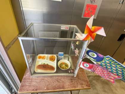 豚肉と野菜のカレースープ煮、変わりピザ、コッペパン、マーガリン、牛乳、ミックスフルーツ(缶づめ)