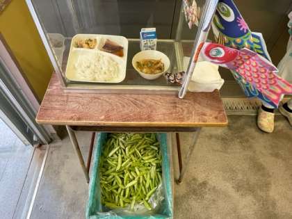 今日のえんどう豆は、給食室でさやから取り出した生のえんどうを使っています。