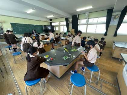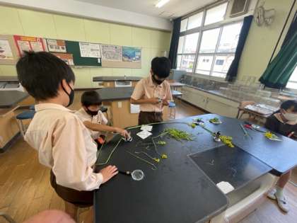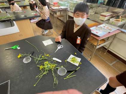 理科室では、4年生のときに学習園で植えたアブラナの観察をしていました。