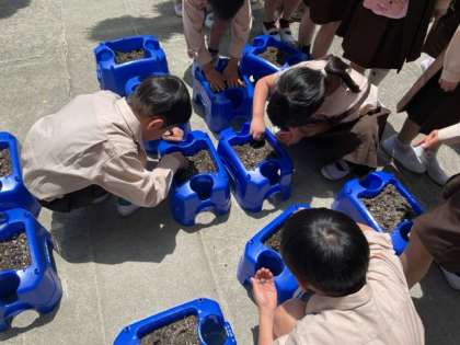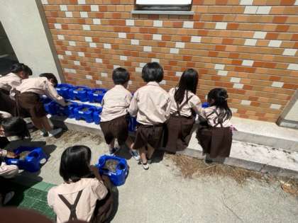 1年生が朝顔の種まきをしていました。しっかりとお世話をしてきれいな花を咲かせてください。楽しみにしています。