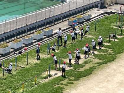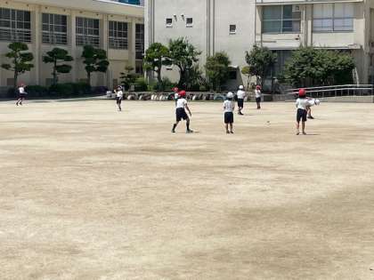 2年生がグラウンドで体育をしていました。ボール投げのクラスと鉄棒のクラスがありました。下は北門横の栗の木です。