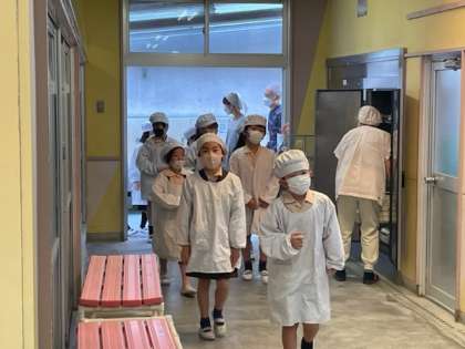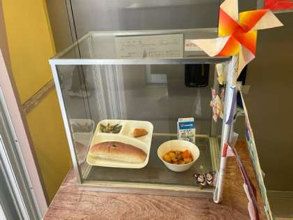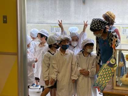 ケチャップ煮、さんどまめとコーンのソテー、焼きかぼちゃの甘みつかけ、レーズンパン、牛乳     です。