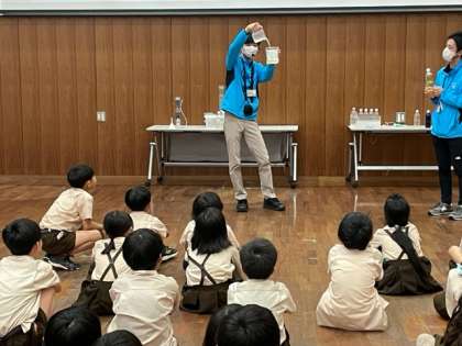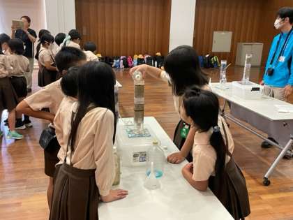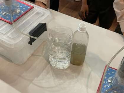 実験が始まりました。淀川の水を砂で濾過することでゴミがなくなり透明になりました。