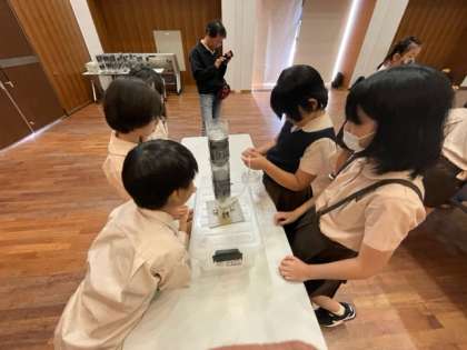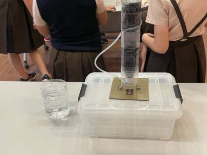 次の実験は、色をつけた水を粒状活性炭の層に通すことで透明にする実験です。ジュースで実験すると無臭の水になるそうです。最後は、塩素を少し入れて殺菌をしているそうです。