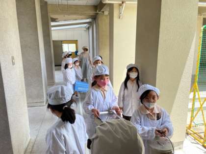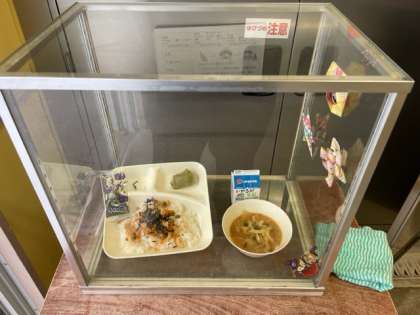 本日の献立は、かやくご飯、みそ汁、まっ茶ういろう、牛乳 です。