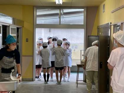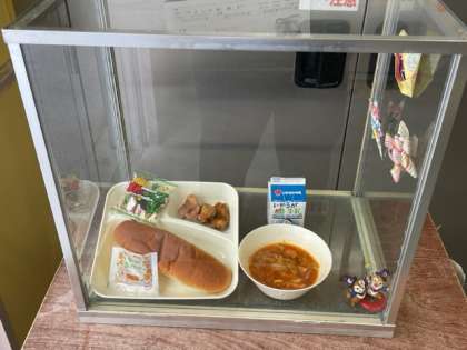 一口トンカツ、ミネストローネ、コッペパン、アプリコット(ジャム)、豆こんぶ、牛乳 です。