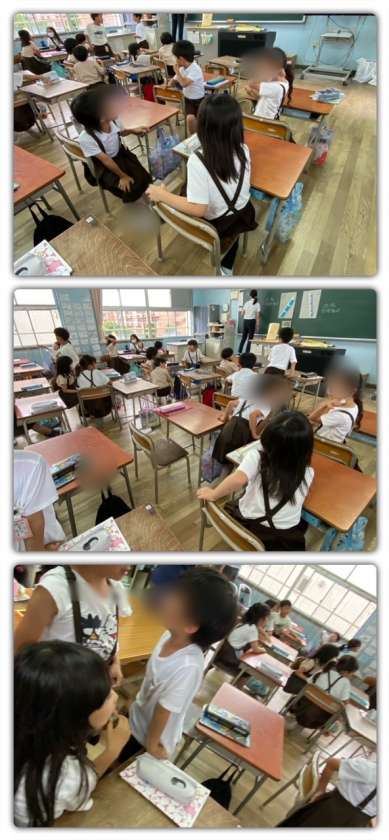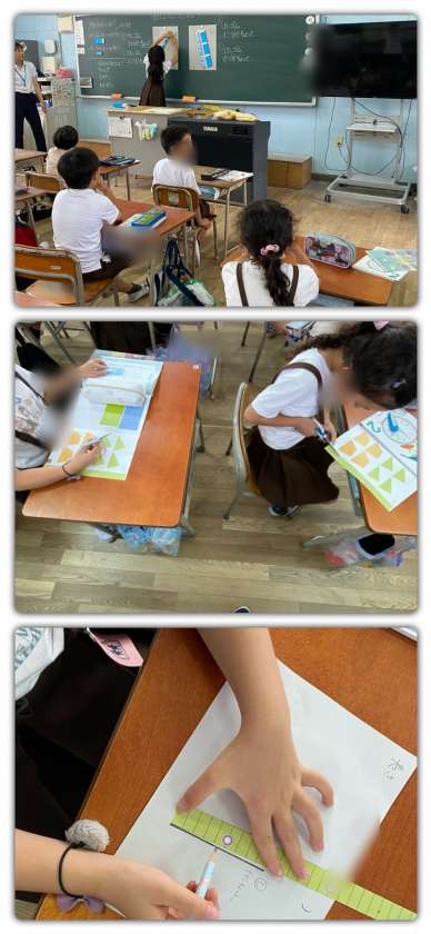 物を並べて測ったり、小さな差はモノの向きを変えてみたりして長さを比べました。