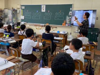 音楽で旋律づくりをしました。みんなが書いた旋律をリコーダーで演奏して、変化をつけていきました。