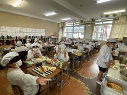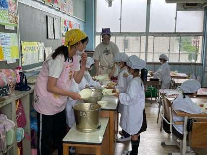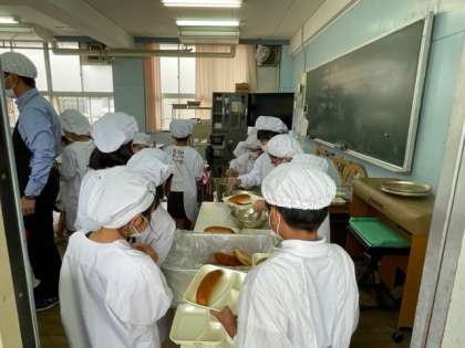 スープには、たまねぎ、にんじん、グリーンピース、鶏肉が入っていました。パンにウインナーをはさんで食べている児童もいました。