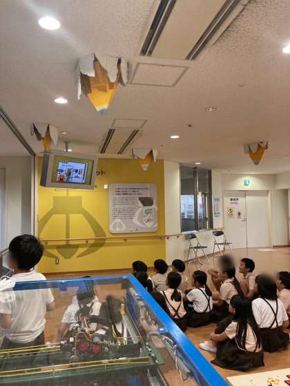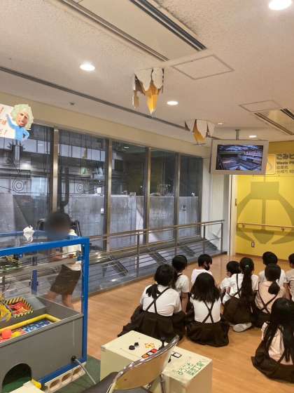 焼却工場では、動画を見たり、ごみピットのごみクレーンを見たりしています。