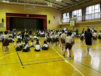 本日は児童集会です。つる小まつりについて、話し合っています。