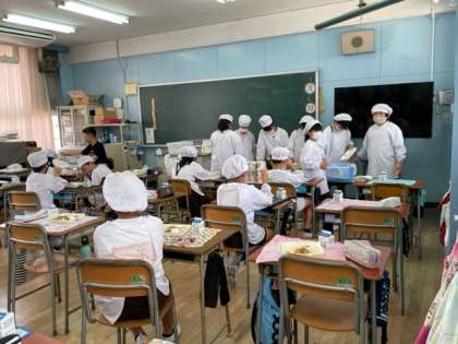 本日の献立は、子どもたちに大人気の牛丼です。他に、もやしとピーマンのごまいため、2時間煮込んでいる大福豆の煮もの、牛乳です。