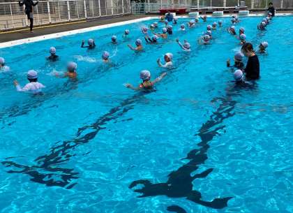 水をかけあったり、潜ったり、楽しんで活動しています。