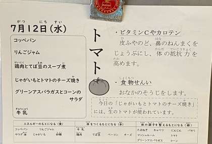 「じゃがいもとトマトのチーズ焼き」のメニューは、生のトマトが使われておりましたが、あっさりとした味付けでじゃがいもとチーズの旨味がよく出ていたため、トマトが苦手な子もよく食べていました。