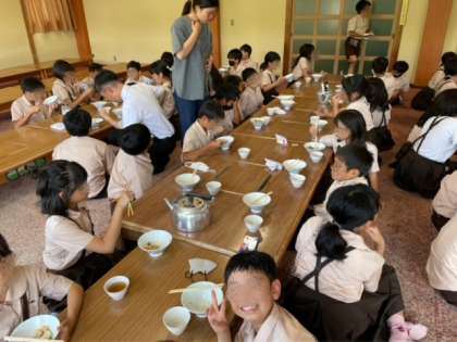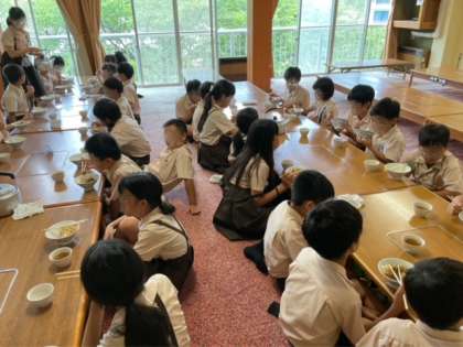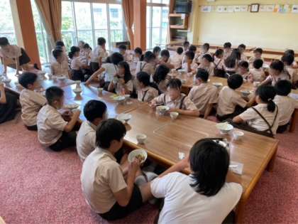 林間学習最後の昼食は、牛丼でした。みんなしっかり食べています。この後、3日間の振り返り、閉舎式を行なってから帰路に着きます。