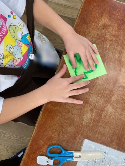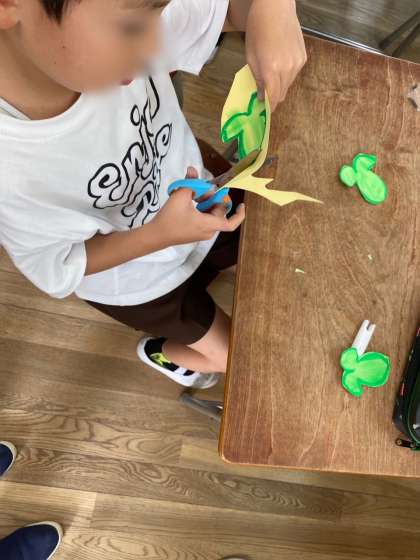 図画工作で、アサガオの葉や花を画用紙とクレパスで表現して作りました。