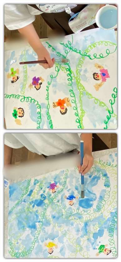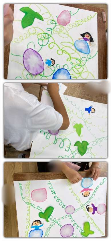 画用紙にツルや人を描いて、昨日描いた花と葉を画用紙の上に並べ、バランスを考えながら、花や葉を増やして作ったり、配置を変えたりして、作っていきました。