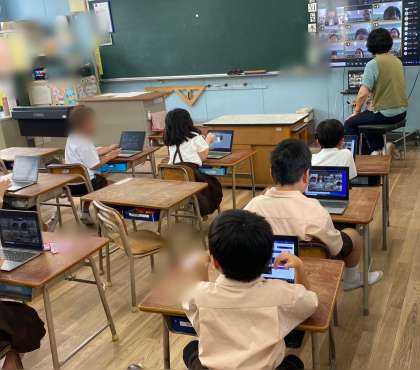 教室の中で、双方向通信の仕方の学習を学びました。それぞれが個別でサインを送ったり、マイクで名前を言ったりして、通信の方法を覚えました。