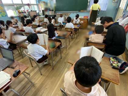 音読で、「かいがら」の話を読みました。物語も少しずつ長い話になってきています。会話の部分に気をつけて読んでいます。