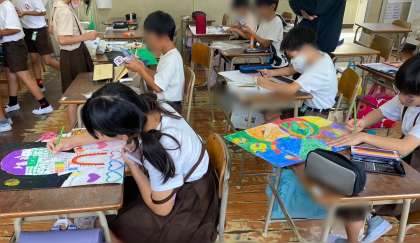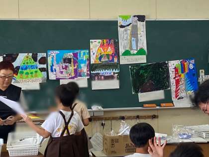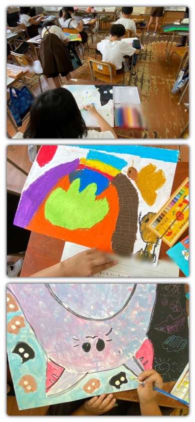 図画工作で、色鉛筆、絵の具、クレパスなどさまざまな画材を活用して、それぞれのイメージした世界の絵を描きました。
