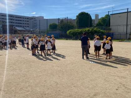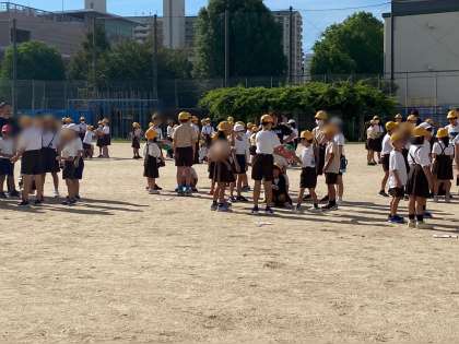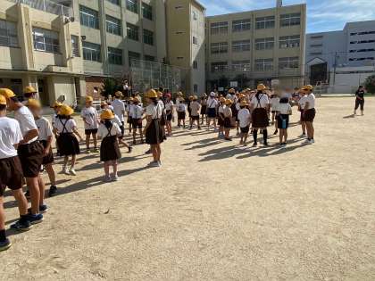 久しぶりに、運動場で集会をしました。音楽に合わせてボールを回し、音楽が止まった時にボールを持っていたらアウトとなるゲームをしました。音楽を聞きながら、みんなあわててボールを回して遊びました。