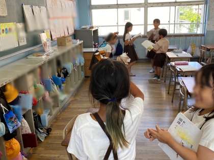 グループごとに担当する場面を決め、動作化をして、練習をしました。授業の後半、みんなの前で話を発表しました。