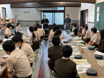 伊賀焼体験スタートです。説明を聞く顔が真剣です。どんな作品ができるでしょうか?