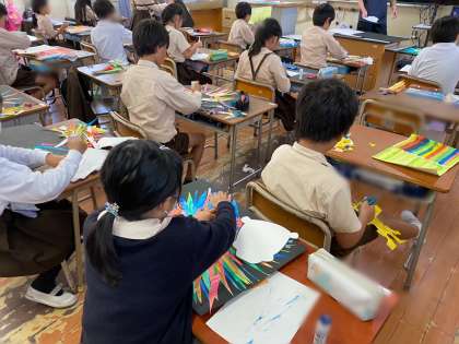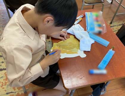 図画工作で、ライオンの作品作りの続きをしています。顔の部分の色は、絵の具でつけています。