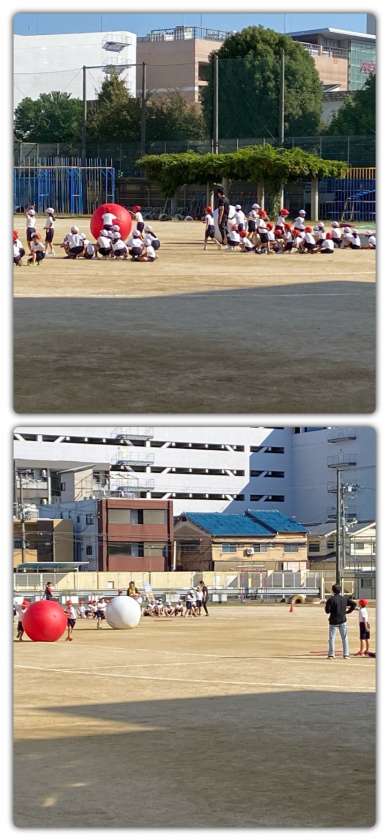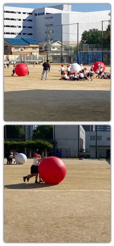 自分よりも大きな玉を力を合わせて早く転がすことはとても大変です。