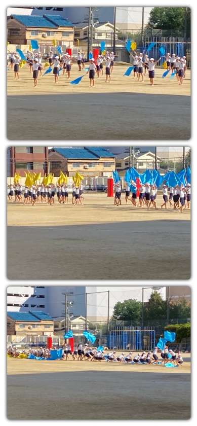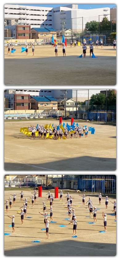 6年はフラッグを使います。みんなでまとまって動くことを目指して練習しています。