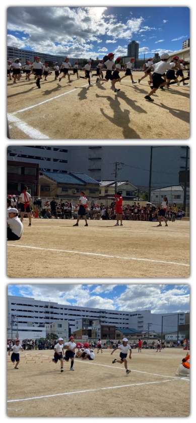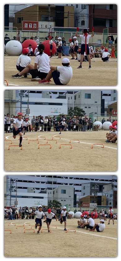 個人走は、障害物競走で行いました。フープや縄跳び、ハードルなど、課題をクリアしないと進めません。足が速いだけでは、勝てない競争です。スタートは勝っていても、課題途中で逆転もあり、応援の声も高まっていました。