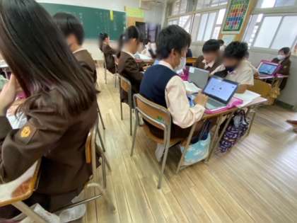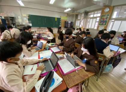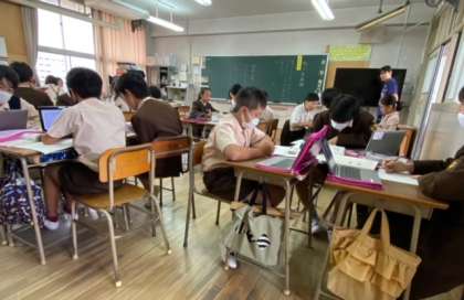 自分たちの町で、困っていること、何があれば良いかを考え、エビデンスになるものをタブレット端末で調べて話し合っています。