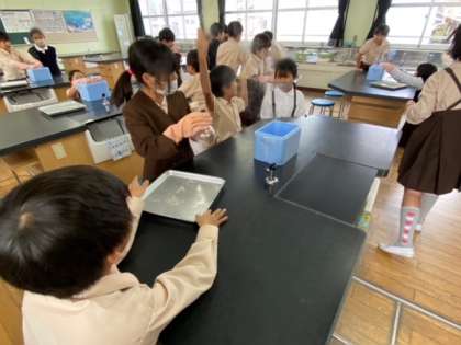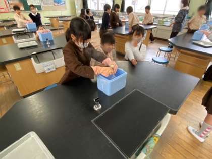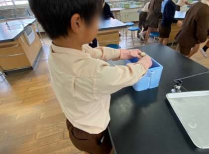 理科の学習で、空気を温めた時にどのように変わるか、ビーカーに蓋をしたものを温かいお湯の中に入れて、実感しました。