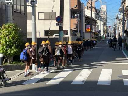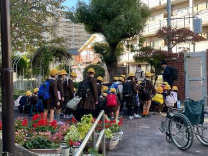 3年生が元気よく校外学習に出発しました。一日楽しんできてください。気をつけて行ってらっしゃい。