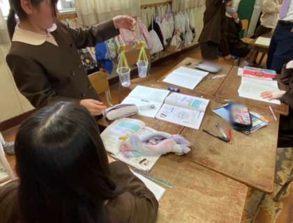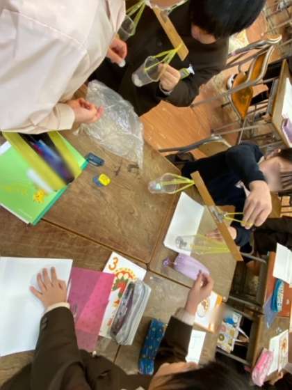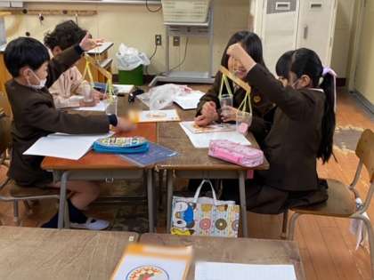 算数では、ものさしで作った天秤と1円玉を使って、身の回りにある物の重さを計りました。