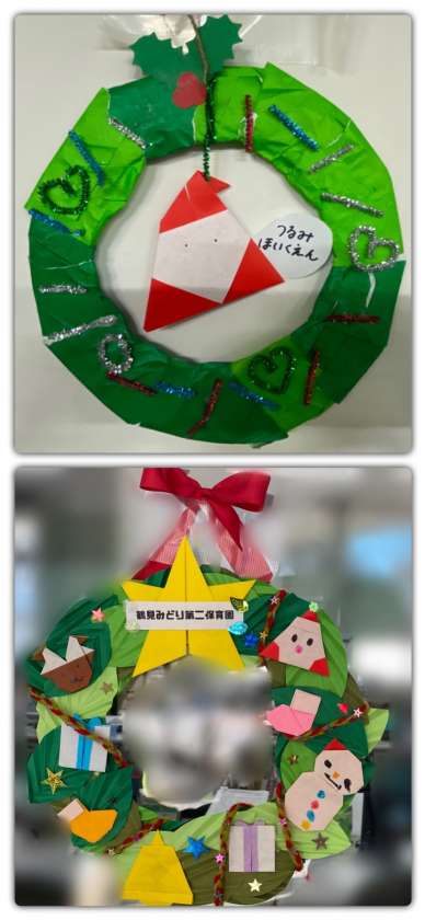 3園の子どもたちから、かわいいクリスマスリースをいただきました。