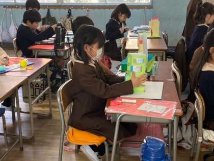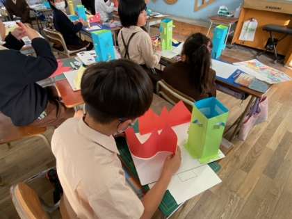 カッターナイフで、画用紙を切り、窓を作って、窓から動物や水の生き物などを覗かせました。