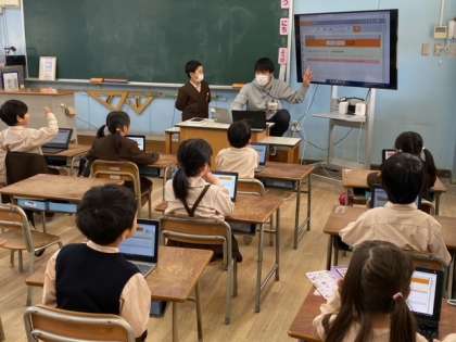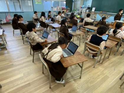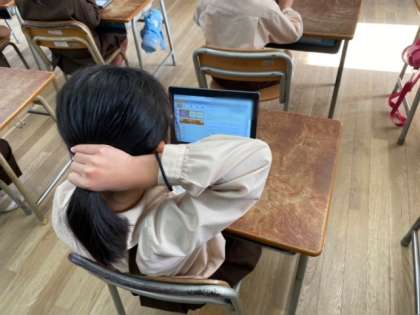 心の天気を入れた後、先生の説明を聞きながら、タブレット端末でアンケートの回答をしています。