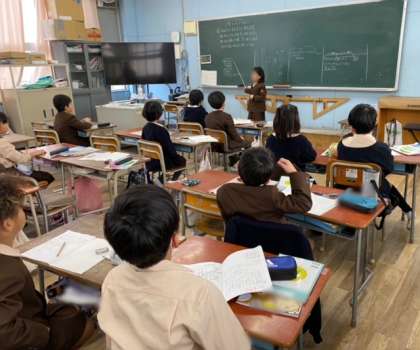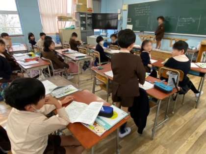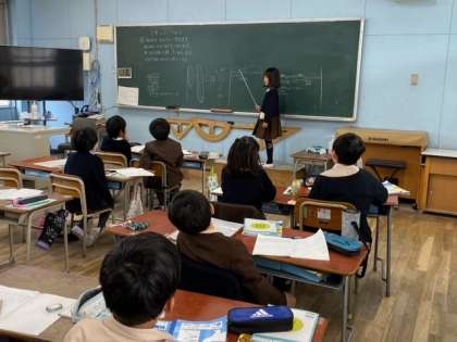 算数では、1年生の学習の振り返り問題に取り組み、解いた過程について、クラスのみんなに自分の言葉で説明して、友だちが理解できるように、双方で付け加えの説明を取り入れて学習をしました。