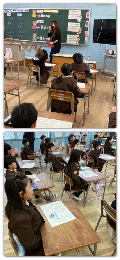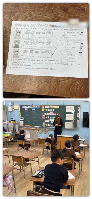 1年生は、みどり小学校の栄養教諭の先生に来ていただいて、「好き嫌いをしないで食べよう」をテーマに栄養について、学習しました。