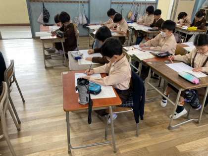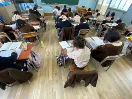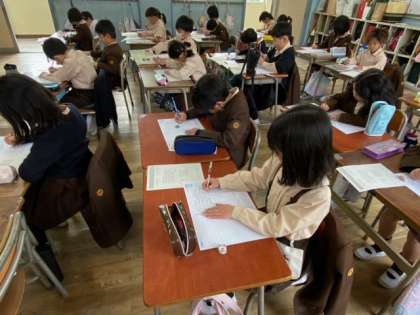 集中して、姿勢も意識しながら手本をよく見て書いています。