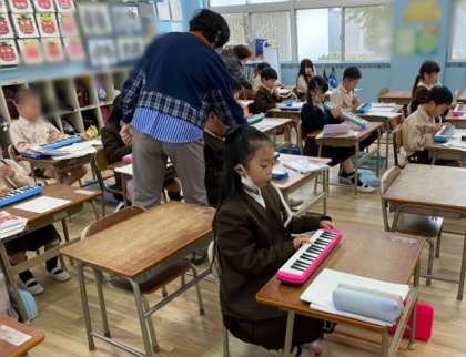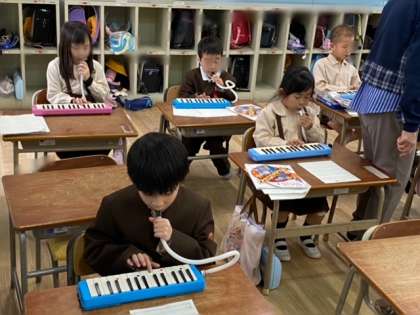 鍵盤ハーモニカで「聖者の行進」の演奏をしました。リズムをとりながら楽しんで演奏をしていました。