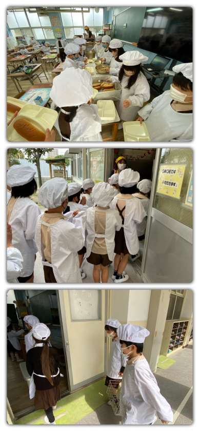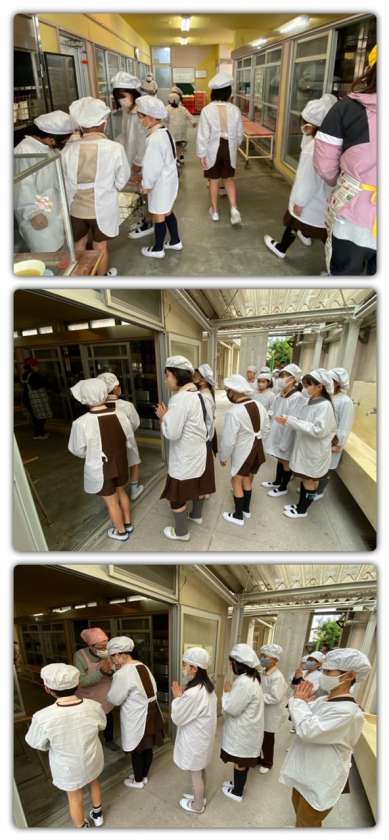 写真の2枚目は、調理員さんが大きな釜から、スープを各学級の食缶に入れているところです。